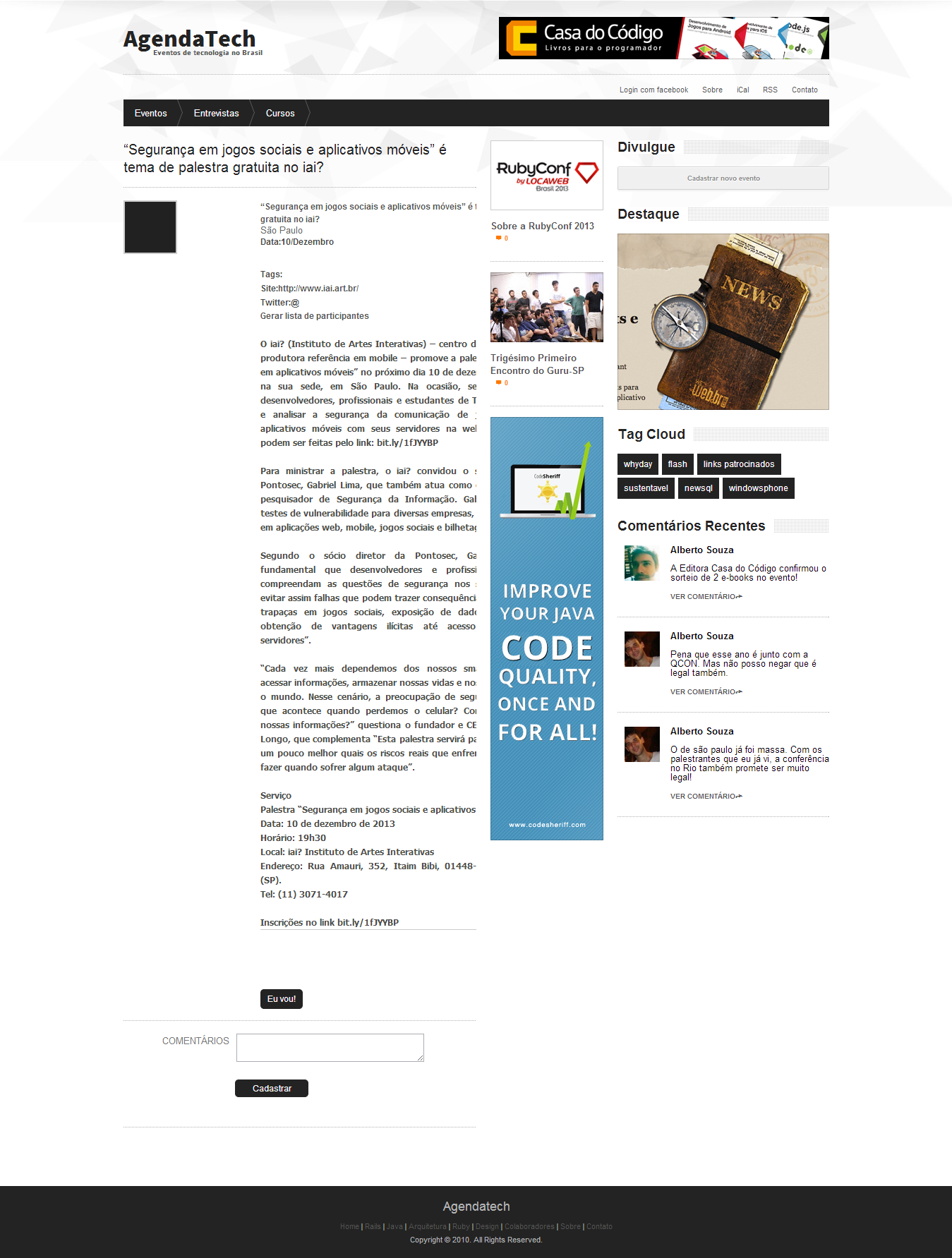 29/11/2013 – AgendaTech – “Segurança em jogos sociais e aplicativos móveis” é tema de palestra gratuita no iai? (Palestra no iai?)