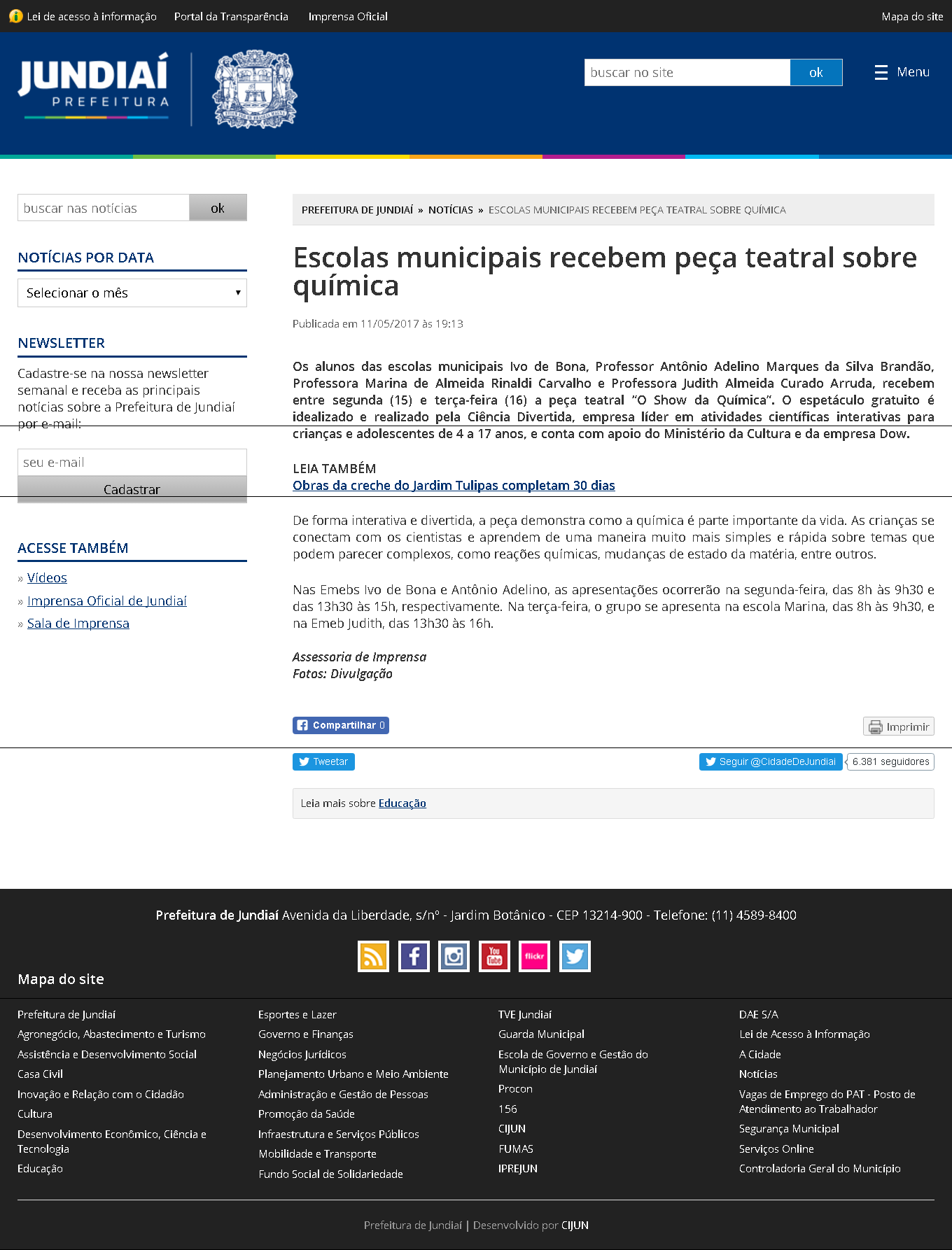 11/05/2017 – Prefeitura de Jundiaí – Escolas Municipais recebem peça teatral sobre química na próxima semana (Release)
